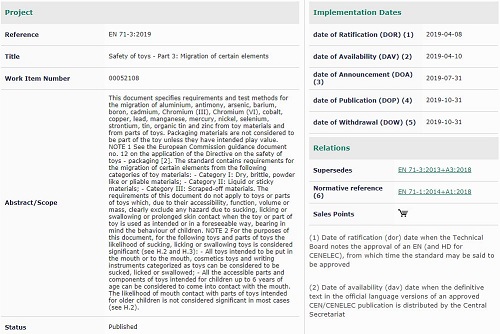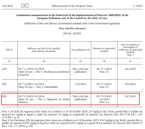 EN 71-3:2019將被賦予歐盟各國國家標準的地位,并且與其沖突的國家標準將最晚在2019年10月31日前被取代。