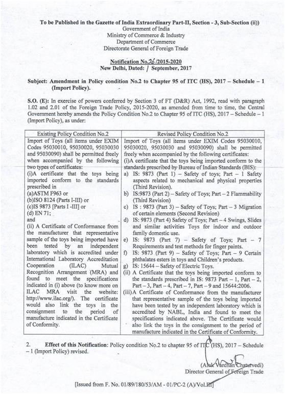 玩具(EXIM code 95030010, 95030020, 95030030, 95030090)必須附以下兩種證書(shū)方可出口: (i)證明出口玩具符合以下標(biāo)準(zhǔn)的證書(shū): (a) ASTM F 963或 (b) ISO 8124 (Parts I-III)或 (c) IS 9873(Parts I-III)或 (d) EN 71 (ii)由生產(chǎn)商提供的證明出口玩具的抽檢樣品已經(jīng)獲得由ILAC-MRA(國(guó)際實(shí)驗(yàn)室認(rèn)證大會(huì)-國(guó)際間互認(rèn)協(xié)議)認(rèn)可的獨(dú)立實(shí)驗(yàn)室檢驗(yàn)并符合上述標(biāo)準(zhǔn)的證書(shū)。該證書(shū)僅對(duì)合格證書(shū)中注明的生產(chǎn)期限內(nèi)的玩具負(fù)責(zé)。 | 玩具(EXIM code 95030010, 95030020, 95030030, 95030090)必須附以下兩種證書(shū)方可出口: (i)證明出口玩具符合印度標(biāo)準(zhǔn)局(BIS)標(biāo)準(zhǔn)的證書(shū)。 (a)IS:9873(Part 1)玩具安全:第一部分 機(jī)械性能和物理性能安全(第三次修訂)。 (b) IS:9873(Part 2)玩具安全:第二部分 易燃性能(第三次修訂)。 (c) IS:9873(Part 3)玩具安全:第三部分 特定元素的遷移(第二次修訂)。 (d) IS:9873(Part 4)玩具安全:第四部分 家用室內(nèi)和室外秋千滑梯及類似玩具安全。 (e) IS:9873(Part 7)玩具安全:第七部分 指畫(huà)顏料的要求和試驗(yàn)方法 (f) IS:9873(Part 9)玩具安全:第九部分 玩具和兒童用品中特定鄰苯二甲酸酯。 (g)IS:15644 電玩具的安全 (ii)出口玩具證書(shū)須符合IS中所述相關(guān)標(biāo)準(zhǔn):IS:9873(Part 1)、IS:9873(Part 2)、IS:9873(Part 3)、IS:9873(Part 4)、IS:9873(Part 7)、 IS:9873(Part 9)、IS 15644:2006 (iii) 由生產(chǎn)商提供的證明出口玩具的抽檢樣品已經(jīng)獲得由印度國(guó)家實(shí)驗(yàn)室檢測(cè)與鑒定認(rèn)可委員會(huì)(NABL)認(rèn)可的獨(dú)立實(shí)驗(yàn)室檢驗(yàn)并符合上述標(biāo)準(zhǔn)的證書(shū)。該證書(shū)僅對(duì)合格證書(shū)中注明的生產(chǎn)期限內(nèi)的玩具負(fù)責(zé)。 |