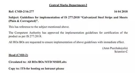 BIS于4月6日發(fā)布的CMD-2/16:277號(hào)文件,IS 277:2003版標(biāo)準(zhǔn)“鍍鋅鋼薄板(平板和波紋板)”已換版至IS 277:2018版“鍍鋅鋼帶與薄板(平板和波紋板)”,并且新標(biāo)準(zhǔn)已經(jīng)發(fā)布。2018年8月18日起,IS 277:2003版標(biāo)準(zhǔn)將廢除。此文件于4月16日通過主管部門批準(zhǔn),鍍鋅鋼卷與薄板產(chǎn)品將按照IS 277:2018版標(biāo)準(zhǔn)進(jìn)行認(rèn)證。通知從發(fā)布之日起立即生效。