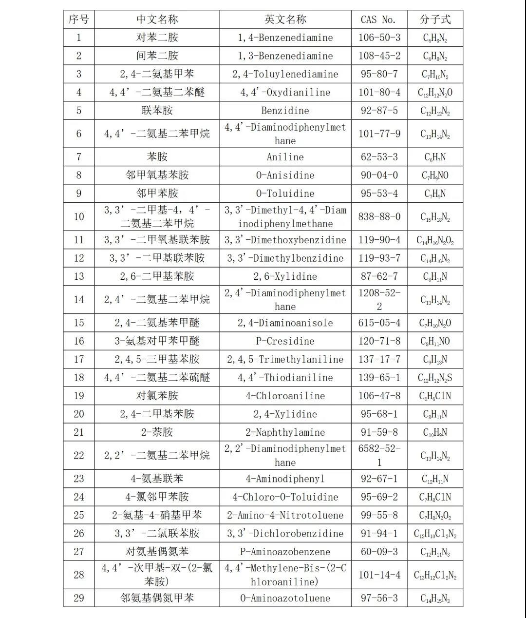 標(biāo)準(zhǔn)規(guī)定了食品接觸材料及制品中29種芳香族伯胺遷移量的測定方法。下圖為29種芳香族伯胺的名稱、CAS號以及分子式。