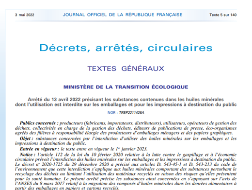 2022年4月13日,法國生態(tài)轉型部批準了指令Arrêté du 13 avril 2022《禁止在供公眾使用的包裝和印刷品上使用礦物油》,并于2022年5月3日刊登在法國官方公報,該指令第一階段要求將于2023年1月1日實施。