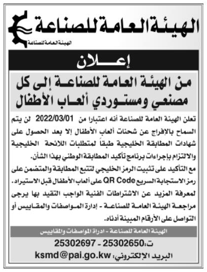 近日,科威特工業(yè)部PAI(The Public Authority for Industry)發(fā)出公告,即日起,所有兒童玩具制造商和貿(mào)易商需要按照GCC技術(shù)法規(guī)的要求獲得海灣型式檢驗證書(Gulf Type Examination Certificates),并同時符合科威特標準保障方案KUCAS的評定要求,才可以順利進入科威特市場。