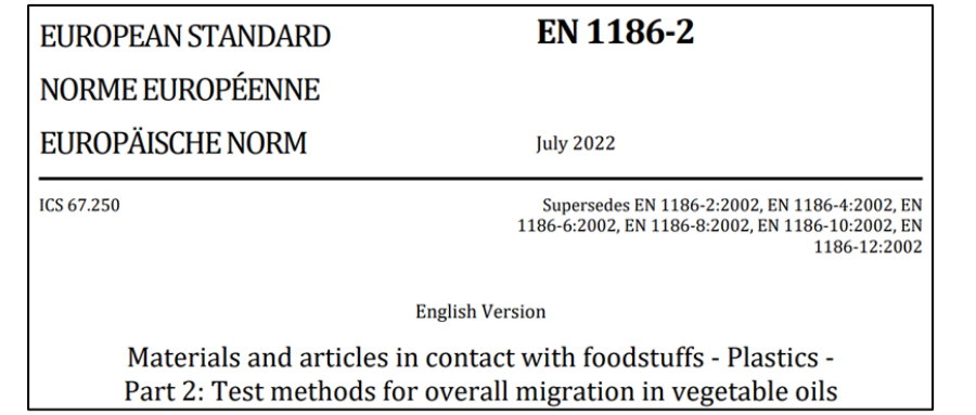 新版EN 1186-2:2022:將測試“橄欖油中總遷移量”的原六項2002版標(biāo)準(zhǔn)EN 1186-2、1186-4、1186-6、1186-8、1186-10和1186-12整合為一個標(biāo)準(zhǔn)。