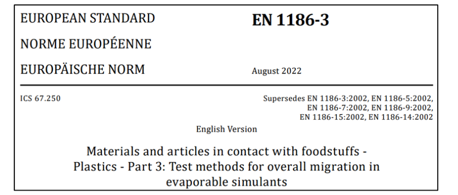 新版EN 1186-3:2022:將測試“水基模擬物及替代溶劑中總遷移量”的原六項2002版標(biāo)準(zhǔn)EN 1186-3、1186-5、1186-7、1186-9、1186-14和1186-15整合為一個標(biāo)準(zhǔn)。