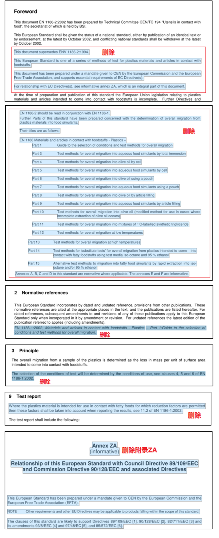 刪除了2002版標(biāo)準(zhǔn)中前言、第二章、第三章及文中測試步驟、測試報告中對EN 1186-1:2002的引用,同時也刪除了原標(biāo)準(zhǔn)附錄ZA及相關(guān)引用,以避免相關(guān)法規(guī)更新后導(dǎo)致標(biāo)準(zhǔn)的失效。