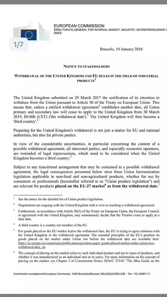 2018年1月10日,歐盟委員會發(fā)布一份給利益相關方的通告,《Notice to Stakeholders: Withdraw of theUnited Kingdom and EU Rules in the Field of Industrial Products》 說明了一些英國退歐對于工業(yè)產(chǎn)品相關方面歐盟規(guī)則的事宜。