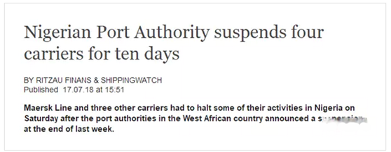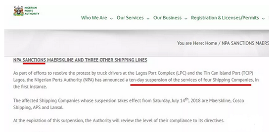 尼日利亞港務局(NPA)在一份新聞稿中表示,從當?shù)貢r間7月14日開始,尼日利亞所有港口將暫停對馬士基,中遠海運,APS和Lansal四家航運公司提供港口服務,為期10天!