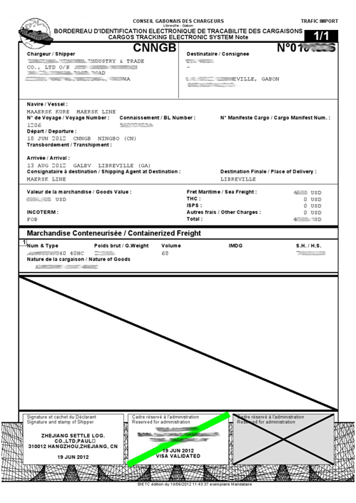 所有發(fā)往加蓬(Gabon)的貨物均需申請(qǐng)辦理BIC/CRN,否則將導(dǎo)致船公司無法簽發(fā)提單以及目的港無法清關(guān)。加蓬BIC貨物跟蹤單也叫加蓬(Gabon)CRN貨物跟蹤單。
