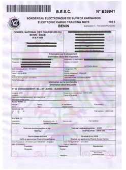 根據(jù)貝寧國法令,凡發(fā)貨至貝寧科托努 (COTONOU) 港或經(jīng)由此港轉(zhuǎn)往其他目的地的貨物都必須申請(qǐng)電子貨物跟蹤單BESC,BESC全稱為:BORDEREAU DE SUIVI DE CARGAISON。